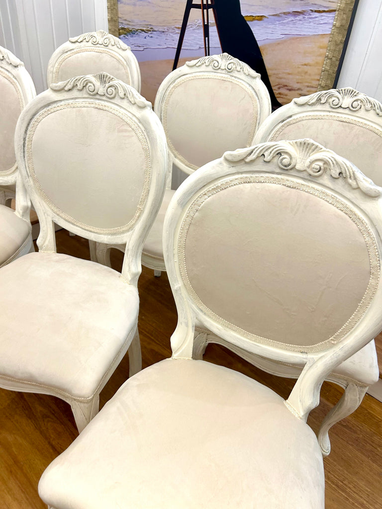 6 x Newly reupholstered Vintage Queen Anne French Provincial Style Dining Chairs. In off white and given an aged and shabby rustic appearance. Newly reupholstered in an off white velvet.