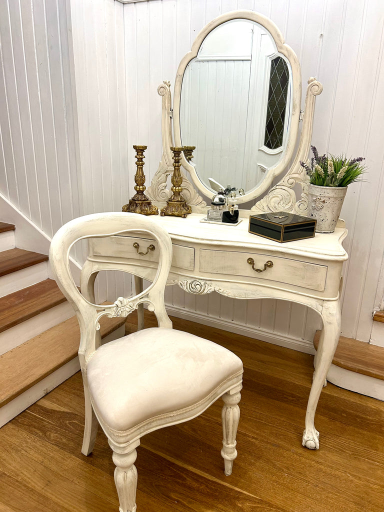 Antique French Provincial Style Dressing Table and Chair. In off white and given an aged and shabby rustic appearance. Chair reupholstered in an off white velvet.