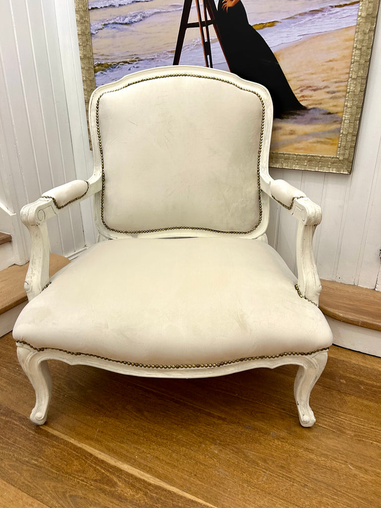 Brand new French Provincial Style Armchair Sitting Chair. Very wide chair perfect for relaxing. In off white and given an aged and shabby rustic appearance. Upholstered I am off white velvet and finished with antique gold coloured studs.