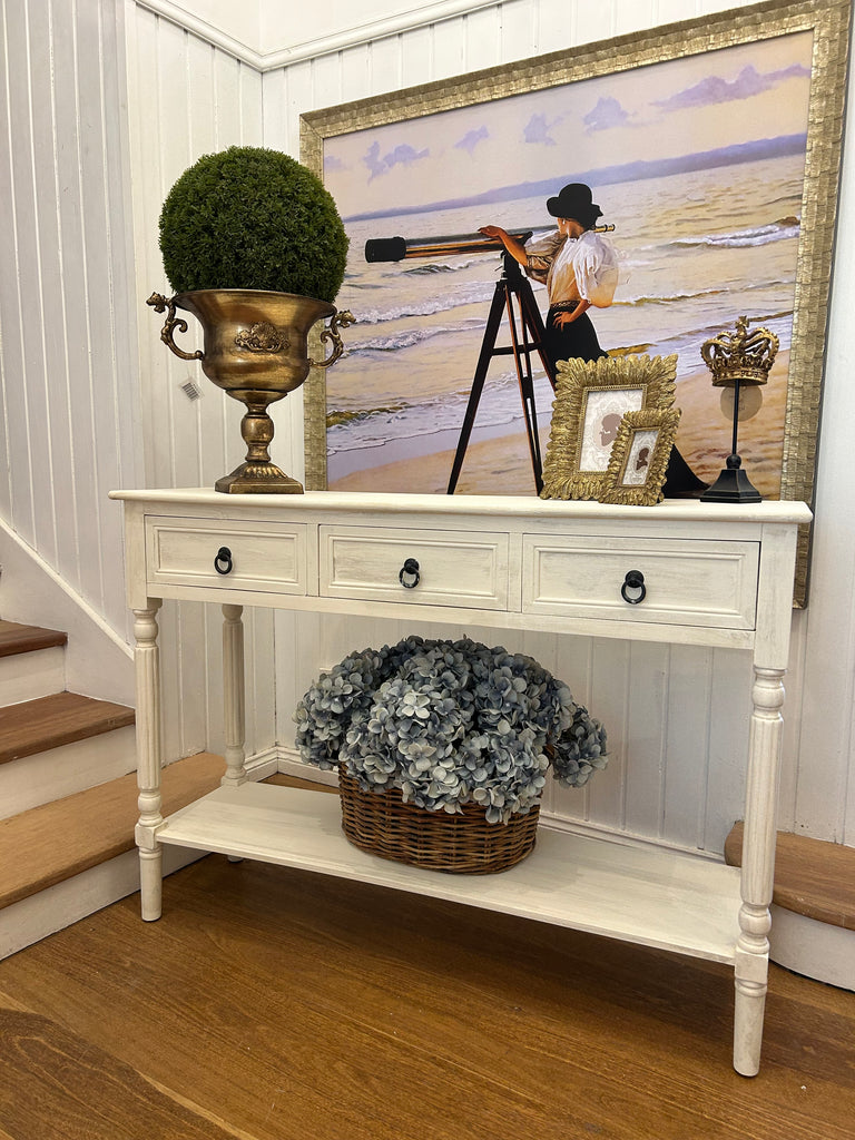 Small French Provincial Style Console Table/Hall Table. In off white and given an aged and shabby rustic appearance.