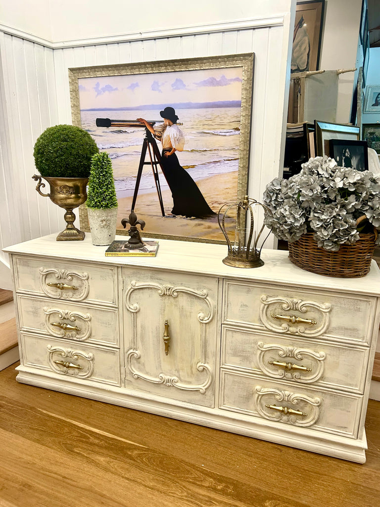Vintage Berryman Dresser or use as a tv unit. In off white and given an aged and shabby rustic appearance.