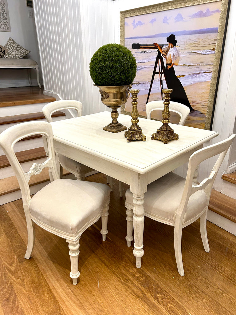 French Provincial Style Dining Set. Including 4x Newly Reupholstered Vintage Chairs and Table. In off white and given an aged and shabby rustic appearance. Chairs reupholstered in an off white velvet.